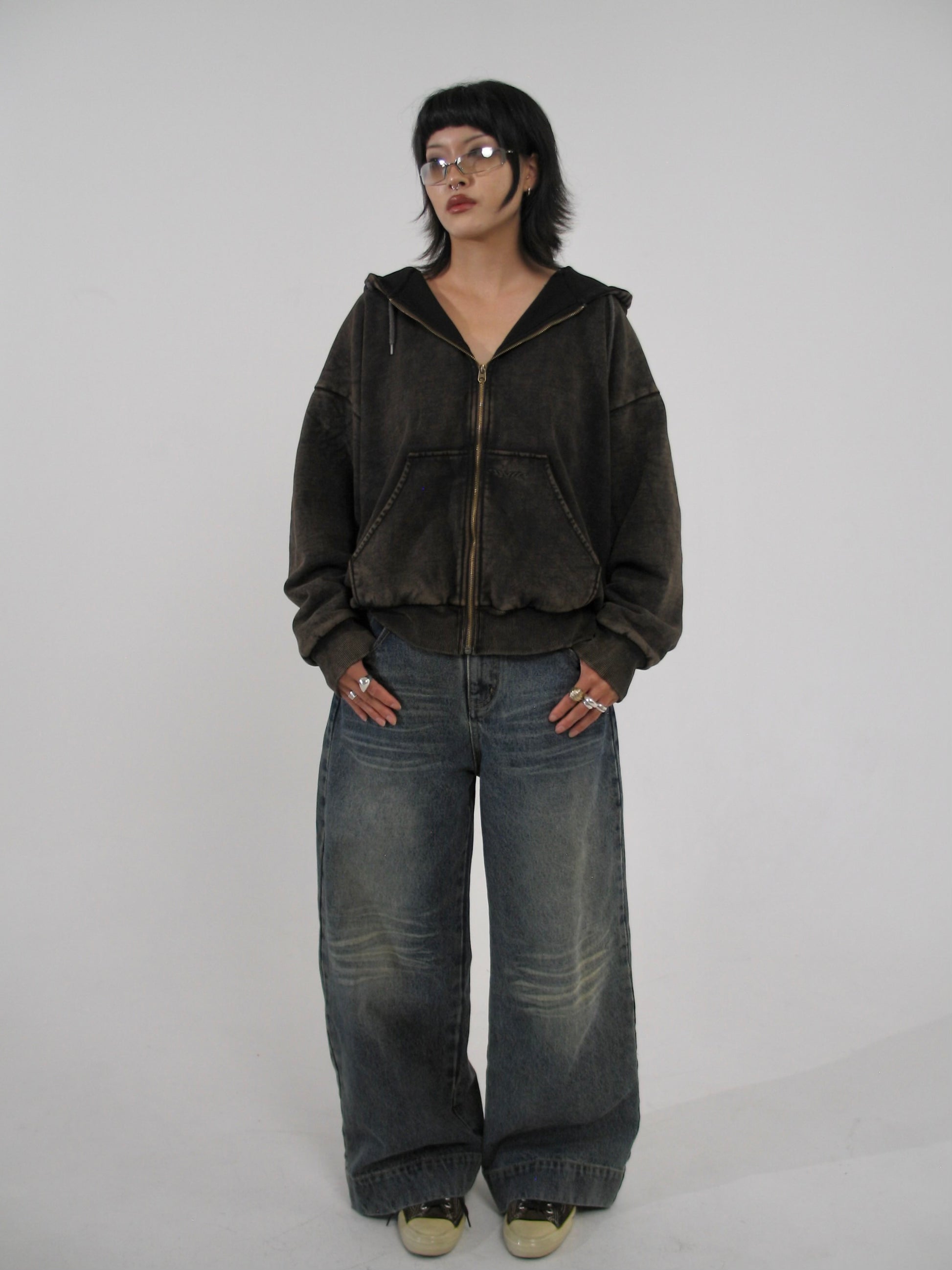 Heavyweight zip-up sweater. Washed brown. 360 GSM. 100% Cotton. Waffle knit lining. Wide and slightly cropped fit. Oversized hood.